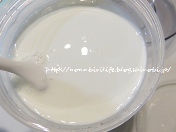 消毒が終わったら、内容器に牛乳と種菌になるR-1ヨーグルトを投入。