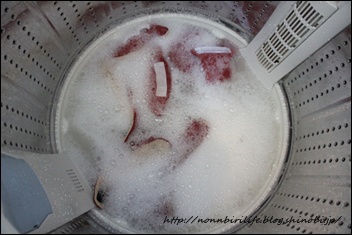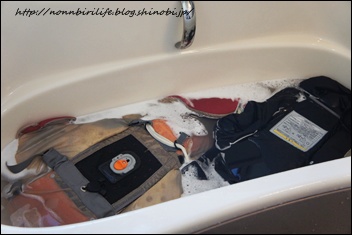 浴槽にお湯と洗濯洗剤を入れて振り洗い。