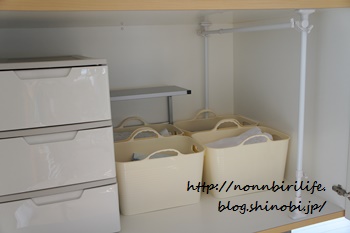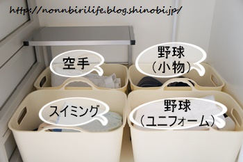 個人で分けずに、習い事別に分けて、ボックス収納。