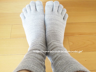 お風呂上りにすぐ履いて、そのまま寝て、翌日はこの上に厚手の靴下を重ねています。