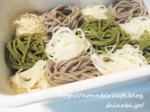 前日の夜に、そうめんとそばと茶そばを茹でて。