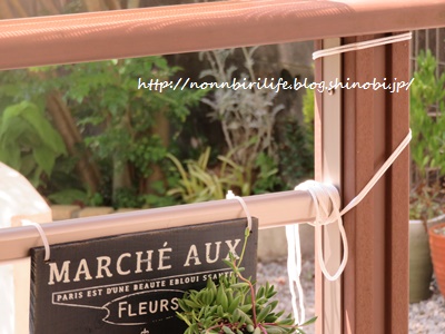 シェードの下部は、両端をウッドデッキの柵部分にひもで巻き付けて。