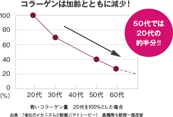 とくに、コラーゲンは加齢とともにこんなに減少するんだそう。