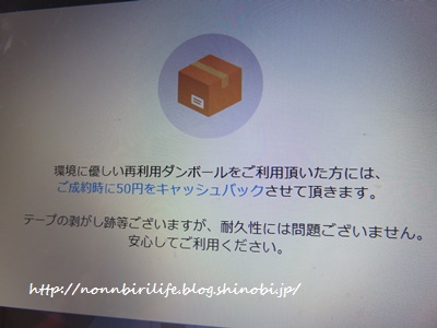 その際、再利用の箱でもOKなら50円キャッシュバックしてもらえるという制度が~。