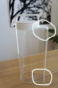 フタ部分と本体の大きさが違うため生じる段差は洗いにくい。(上のマル)