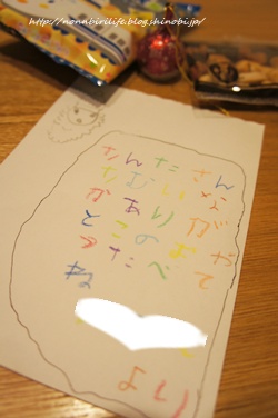 「さんたさん さむいなかありがとう このおやつたべてね ○○より」
