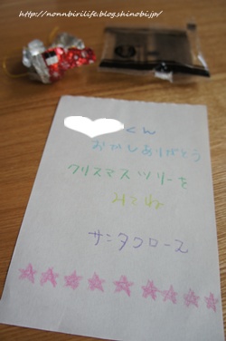 「○○くん おかしありがとう クリスマスツリーをみてね サンタクロース」